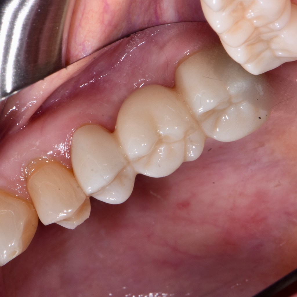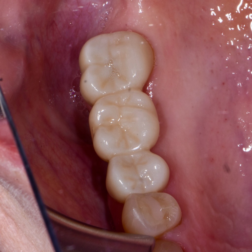 Restored foundation with tooth-colored filling prior to crown.